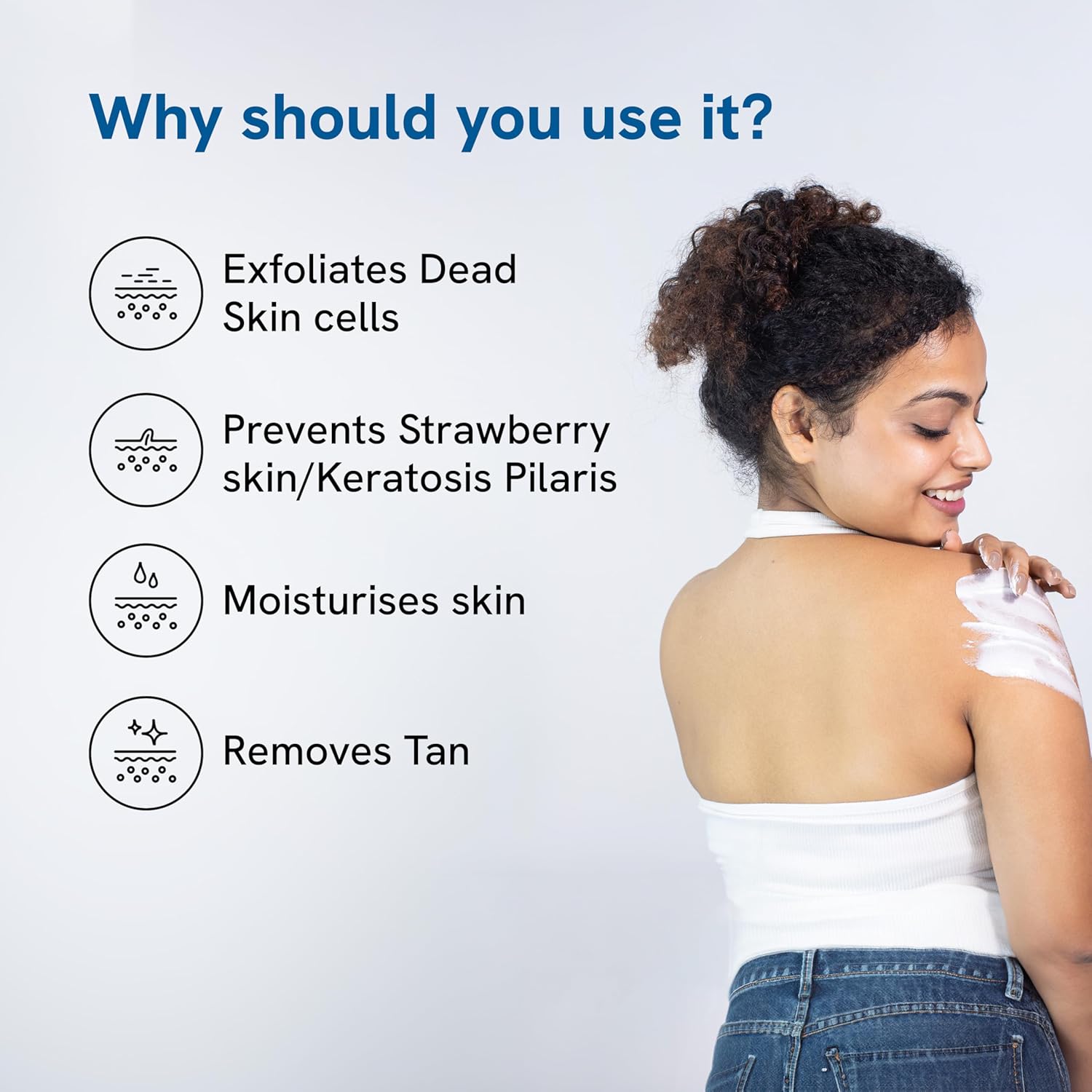 EXFOLIATING & MOISTURIZING BODY SCRUB: 10% AHA body scrub comes in an easy-to-use hygienic packaging, gently exfoliates without stripping off moisture from the skin & detans skin. Regular use helps reduces ingrown hair, & tan.